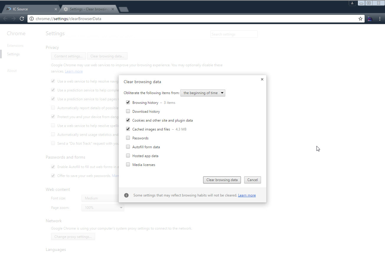 • Assure "Browsing history", "Cookies and other site and plugin data", and "Cached images and files" are all checked